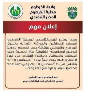 وأعلن المدير التنفيذي المكلَّف لمحلية الخرطوم، عبد المنعم أحمد البشير، أن على أصحاب المحلات بالسوق المركزي والمحلي مقابلة مديري الوحدات الإدارية لتوفيق أوضاعهم القانونية مع المحلية.