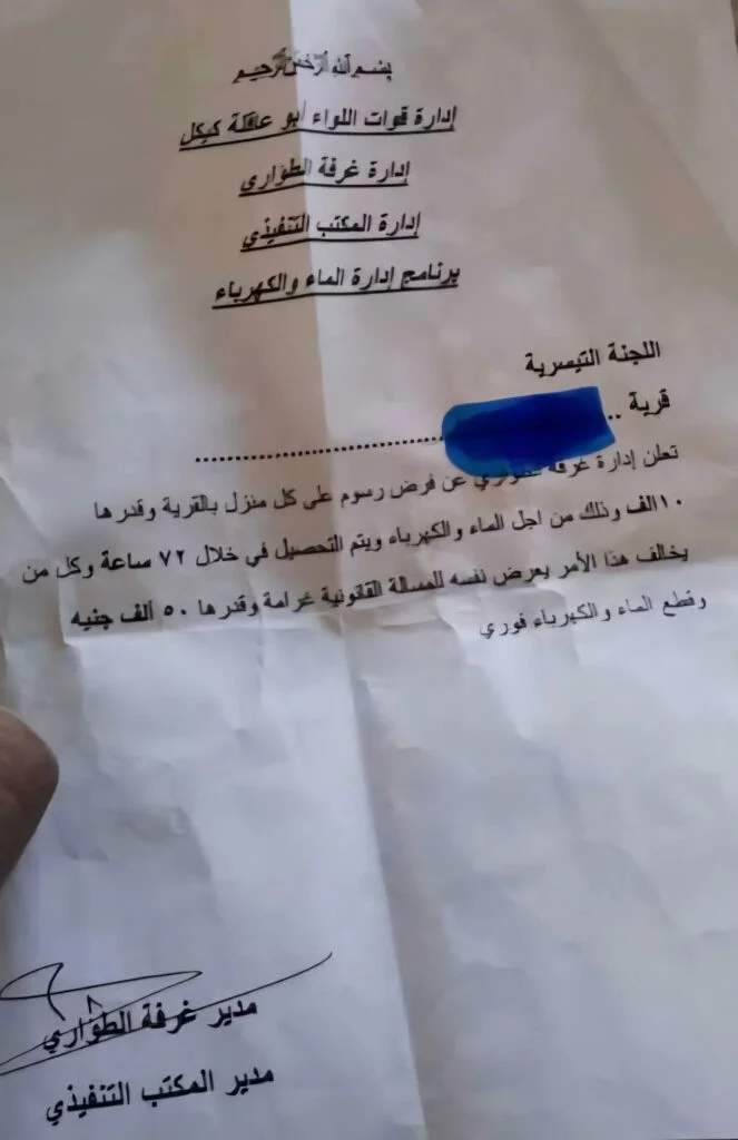 وثيقة مسربة تكشف جباية قسرية للمياه والكهرباء في مناطق سيطرة قوات كيكل