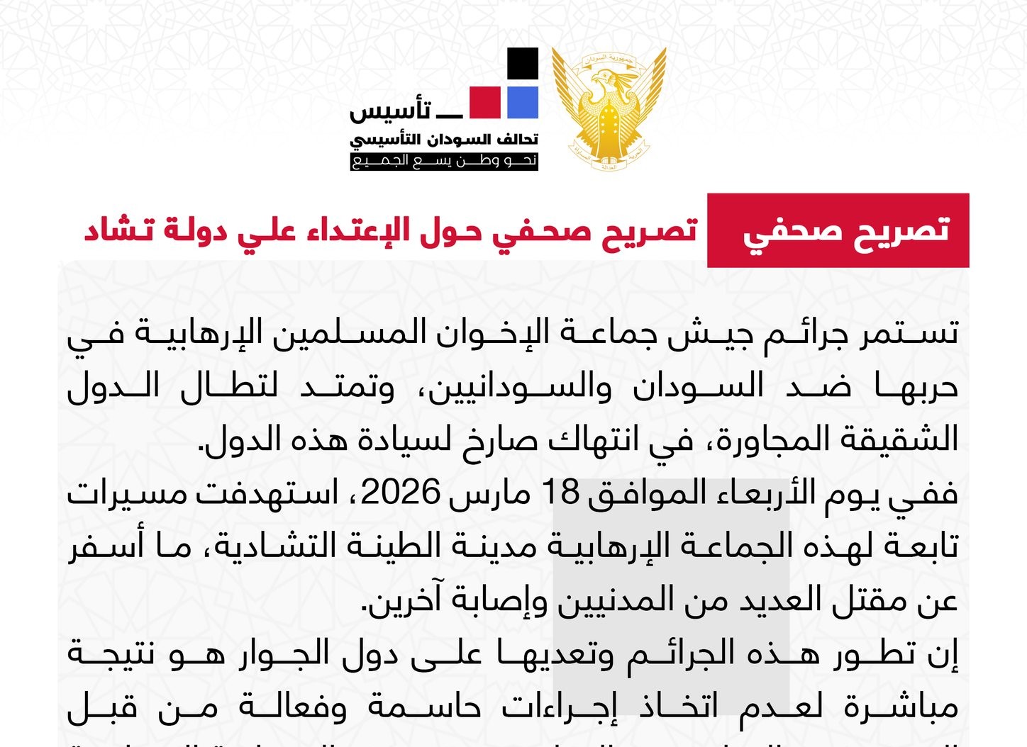 أدان تحالف السودان التأسيسي “تأسيس” الهجوم الذي استهدف مدينة الطينة في تشاد، معتبراً أنه يمثل انتهاكاً لسيادة الدول وامتداداً للصراع الدائر في السودان إلى دول الجوار.