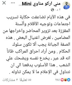 وفي تدوينة نشرها على منصة X يوم الأحد، حمّل مناوي جهات عليا في حكومة بورتسودان مسؤولية تسريب محاضر اجتماع جمع حركته برئيس الوزراء الجديد كامل إدريس، قائلاً: “تضاعفت حكاية تسريب الاجتماعات وتوجيه الأقلام والألسنة المقززة بعد تزوير المحاضر وإخراجها من المضامين”، محذرًا من أن هذه الأساليب تهدف لاغتيال شخصيات سياسية. وتابع: “من أراد إحراق المراكب ظنًّا أنه قد عبر، يخدع نفسه ويضحك على الشعب”.
