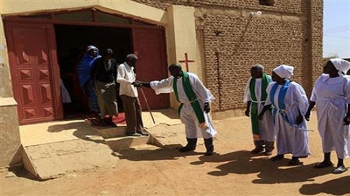 قس يساعد عجوزا بعد حضوره الصلاة في كنيسة على مشارف الخرطوم يوم 10 فبراير شباط 2013. تصوير: محمد نور الدين عبد الله - رويترز