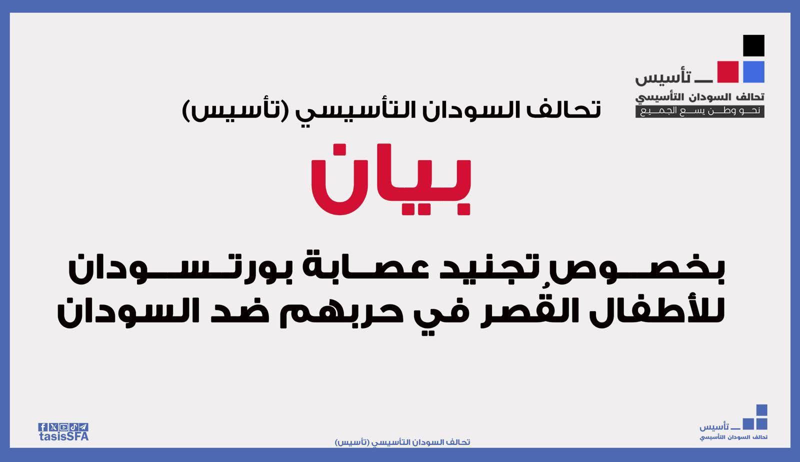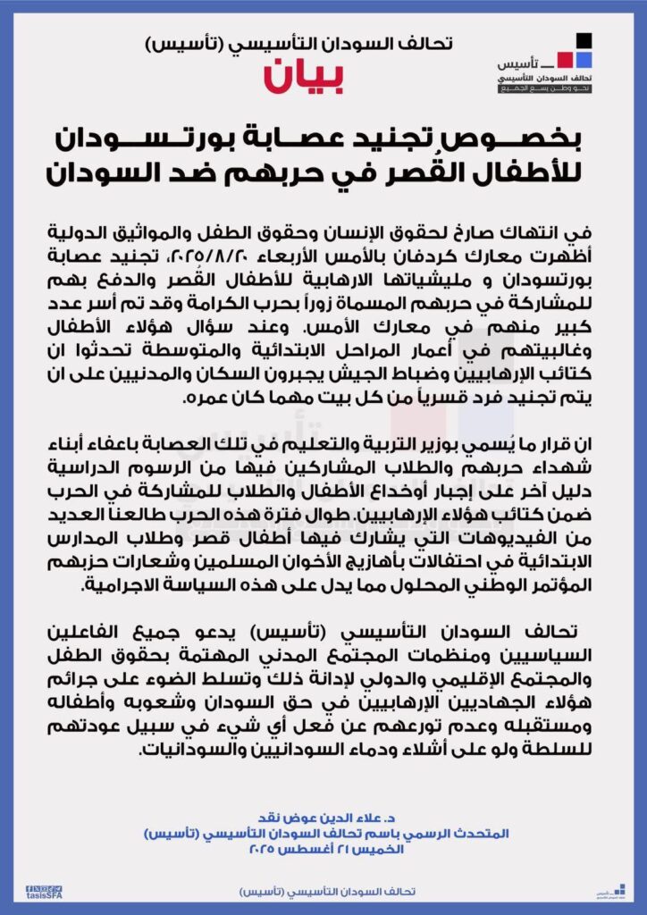 وشدد البيان على أن “تأسيس” سيخاطب المنظمات الحقوقية والإنسانية الإقليمية والدولية لتوثيق هذه الانتهاكات، والعمل على محاسبة المتورطين فيها دون حصانة، مشيرًا إلى أن حماية الأطفال تقع في صدارة الأولويات الوطنية والإنسانية.