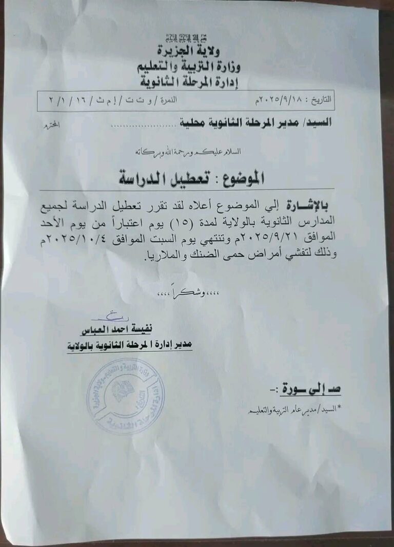 أعلنت وزارة التربية والتعليم بولاية الجزيرة، وسط السودان، تعطيل الدراسة بجميع المدارس الثانوية لمدة 15 يوماً ابتداءً من الأحد 21 سبتمبر وحتى السبت 4 أكتوبر 2025، وذلك في إطار الإجراءات الاحترازية لمواجهة تفشي حمى الضنك والملاريا.