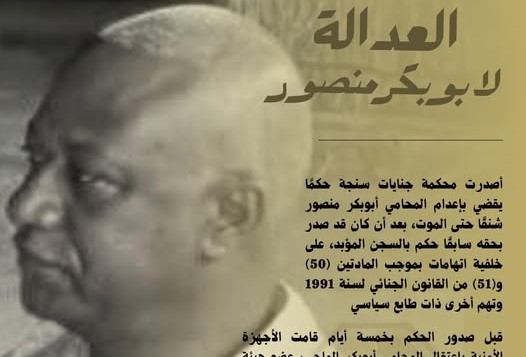 طالبت هيئة محامو الطوارئ السودانية بإلغاء حكم الإعدام الصادر بحق المحامي أبوبكر منصور فورًا، وإعادة النظر في قضيته وفق إجراءات قانونية عادلة وشفافة، مشددة على ضرورة الإفراج الفوري عن المحامي أبوبكر الماحي، عضو هيئة الدفاع المعتقل، وتمكينه من أداء مهامه القانونية بحرية.