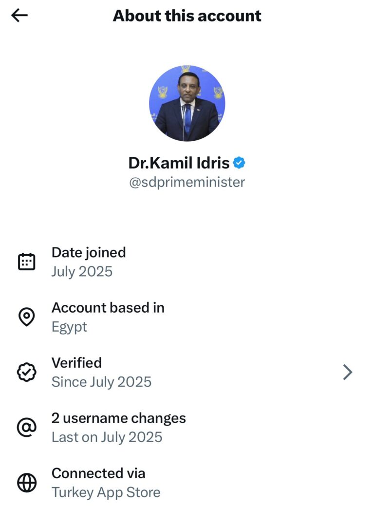 فبحسب بيانات المنصة، تبيّن أن الحساب الرسمي لرئيس وزراء سلطة بورتسودان قد تم إنشاؤه في تركيا، بينما يتم إدارته وتشغيله حالياً من داخل مصر، وهو ما أثار تساؤلات كبيرة حول الجهة الفعلية التي تشرف على الخطاب الإعلامي للسلطة القائمة.
