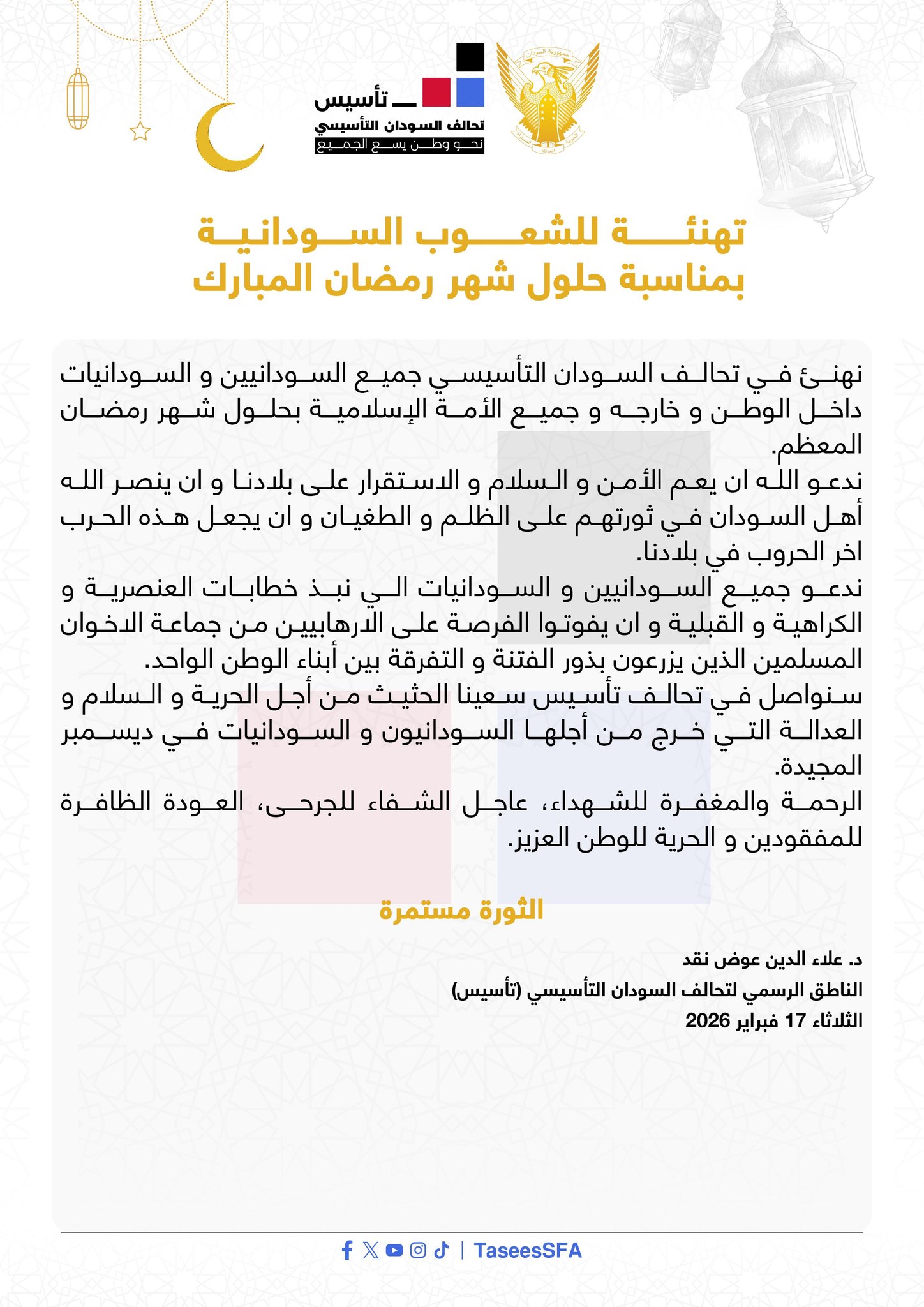 تقدّم تحالف السودان التأسيسي (تأسيس) بالتهنئة إلى جميع السودانيين والسودانيات داخل الوطن وخارجه، وإلى الأمة الإسلامية، بمناسبة حلول شهر رمضان المبارك، متمنياً أن يعمّ الأمن والسلام والاستقرار أرجاء البلاد.