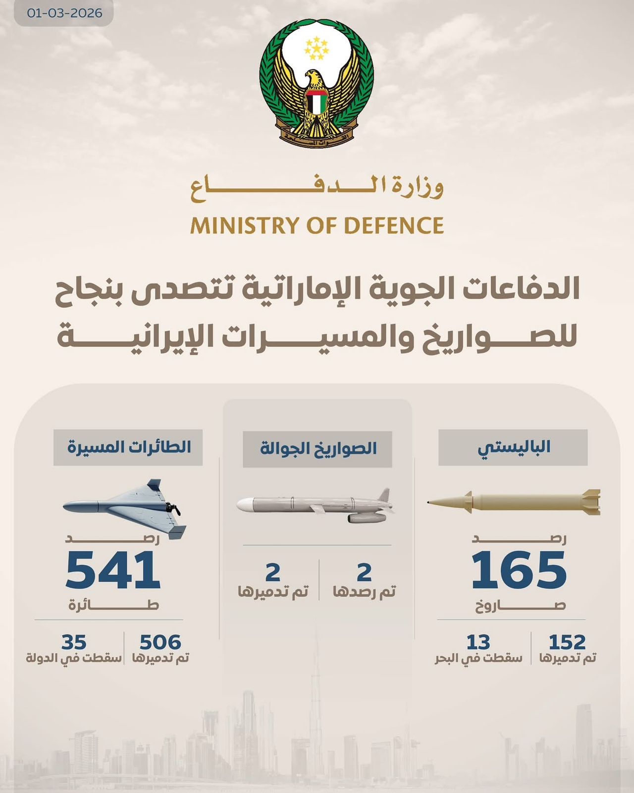 وقالت وزارة الدفاع الإماراتية إن القوات الجوية والدفاع الجوي تصدت حتى الآن لنحو 708 هجمات، من بينها 165 صاروخاً باليستياً، وصاروخان جوالان، و541 طائرة مسيّرة، موضحة أنه تم تدمير الغالبية العظمى منها قبل وصولها إلى أهدافها.