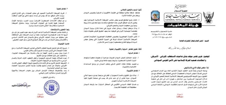 وتأتي هذه التوصيات كجزء من تقييم استراتيجي أوسع أعدته أجهزة الاستخبارات السودانية بشأن تداعيات المواجهة العسكرية المتصاعدة بين الولايات المتحدة وإيران وتداعياتها المباشرة على المشهد السياسي والعسكري في السودان.