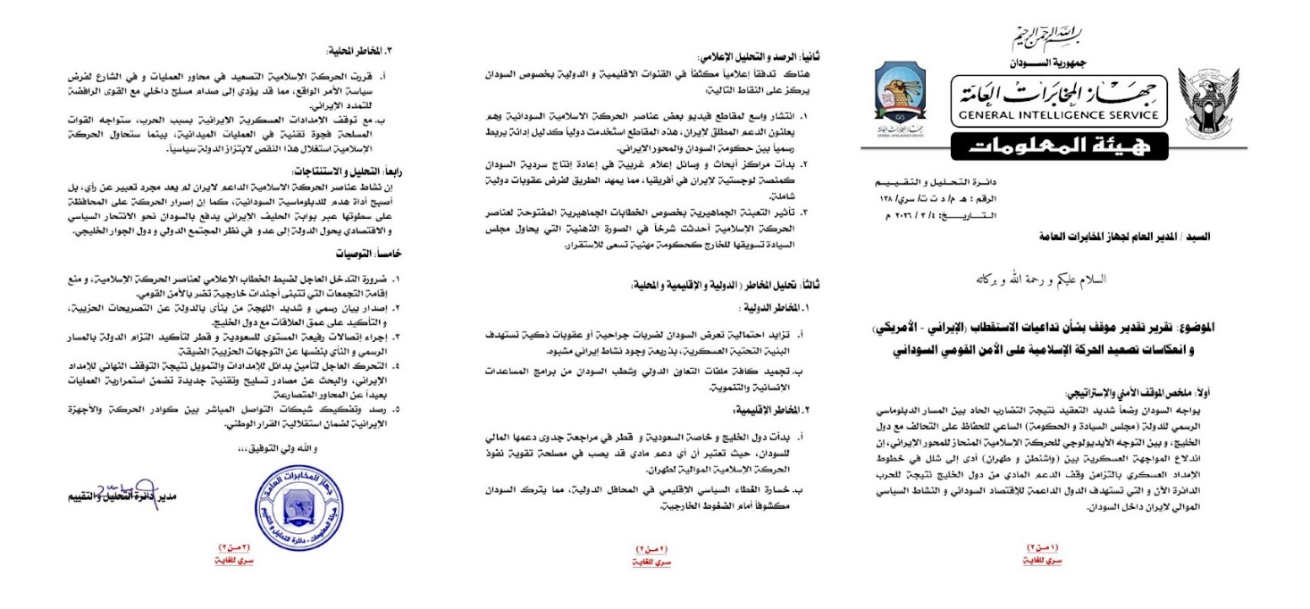 كشفت وثيقة استخباراتية مسربة صادرة عن إدارة التحليل والتقييم التابعة لجهاز المخابرات العامة السوداني عن مخاوف متزايدة داخل المؤسسات الأمنية بشأن تأثير الخطاب السياسي لبعض الجماعات الإسلامية على العلاقات الإقليمية للبلاد، وخاصة مع دول الخليج.