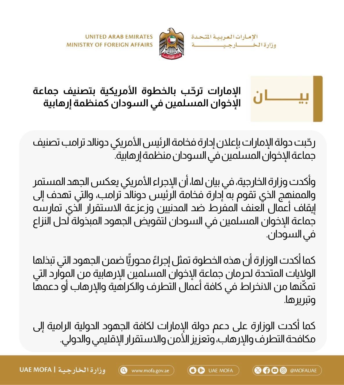 رحّبت الإمارات العربية المتحدة بإعلان إدارة الرئيس الأميركي دونالد ترامب تصنيف جماعة الإخوان المسلمين في السودان منظمة إرهابية.
