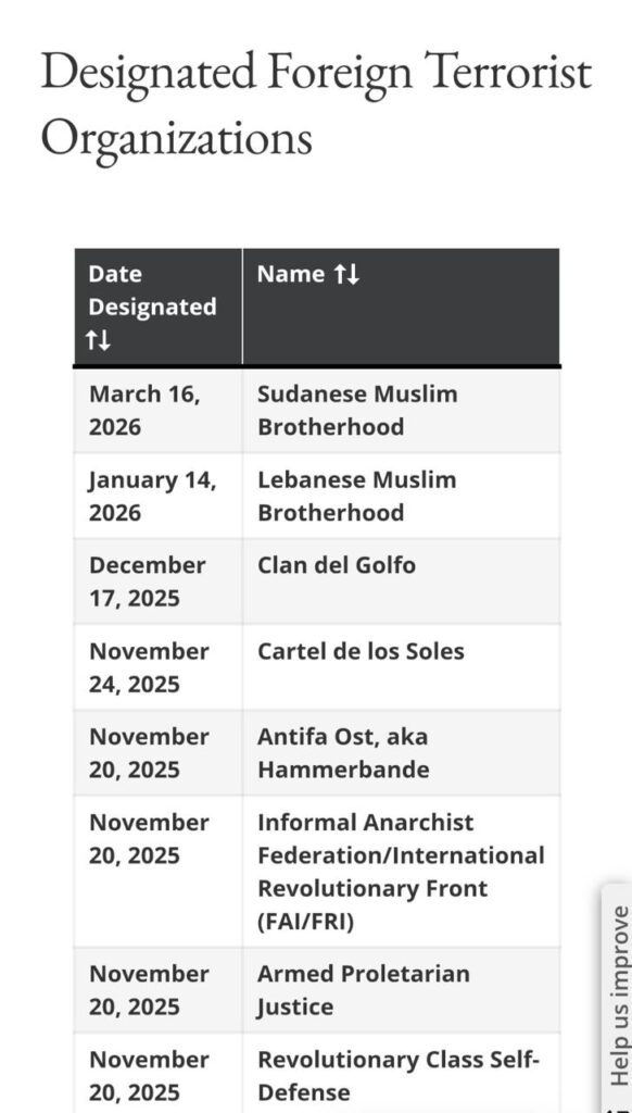 أدرجت وزارة الخارجية الأمريكية جماعة الإخوان المسلمين في السودان رسمياً ضمن قائمة المنظمات الإرهابية الأجنبية، وذلك اعتباراً من 16 مارس 2026، وفقاً للقائمة المنشورة على موقع الوزارة.