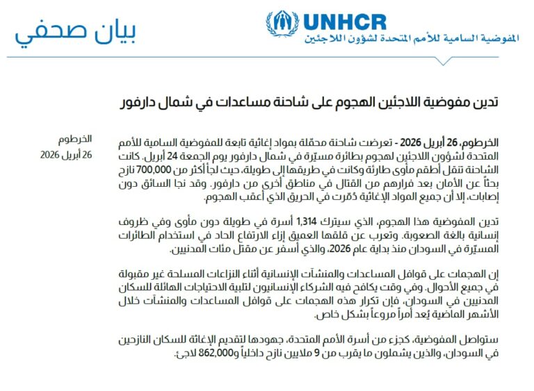 وأكدت المفوضية، في بيان رسمي، أن الشاحنة كانت تنقل إمدادات حيوية مخصصة للمدنيين المتضررين من النزاع، مشددة على أن استهداف قوافل الإغاثة يمثل انتهاكًا خطيرًا للقانون الدولي الإنساني ويعرّض حياة العاملين في المجال الإنساني والمستفيدين للخطر.
