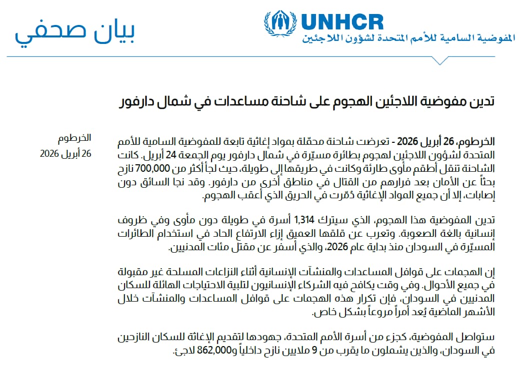 أعربت المفوضية السامية للأمم المتحدة لشؤون اللاجئين عن قلقها البالغ وإدانتها لاستهداف شاحنة تحمل مساعدات إنسانية في ولاية شمال دارفور، في حادثة تسلط الضوء على تزايد المخاطر التي تواجه العمل الإنساني في السودان.